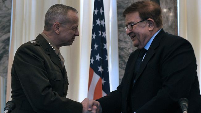 Afghanistan s Defense Minister Abdul Rahim Wardak (R) shakes hands with US commander in Afghanistan General John Allen at the Afghan Foreign Ministry in Kabul, March 9, 2012. شنبه 20 اسفند 1390 ساعت 10:45