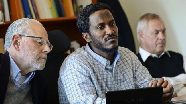 یونس فکری (وسط) به همراه وکیلش در کنفرانس خبری در استکهلم