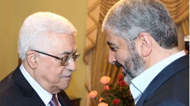 خالد مشعل، رئیس دفتر سیاسی حماس (راست) و محمود عباس، رئیس تشکیلات خودگردان فلسطین (چپ)