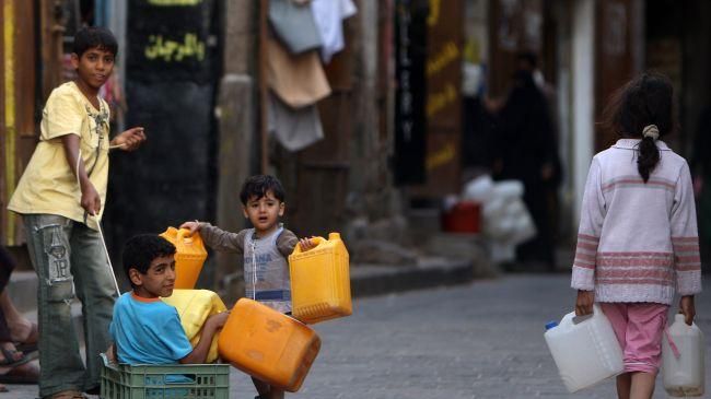 کودکان یمنی ظرف هایی را برای پر کردن با آب در دست دارند.