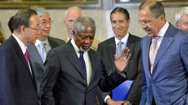 کوفی عنان (وسط) و نمایندگان چین (چپ) و روسیه (راست) به همراه دیگر اعضای شورای امنیت سازمان ملل در نشست ژنو درباره بحران سوریه مذاکره کردند. دوشنبه 12 تیر 1391 ساعت 1:33